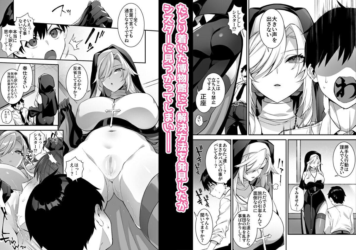 しかし、その解決方法を見つけた瞬間、シスターに見つかってしまい、集団の調和を乱しました。シスターたちは主人公に罰として奉仕させることに決めました。主人公はシスターから解放された後も、休む間もなく、3人の間で精子を争うエロい戦いが続きました。
